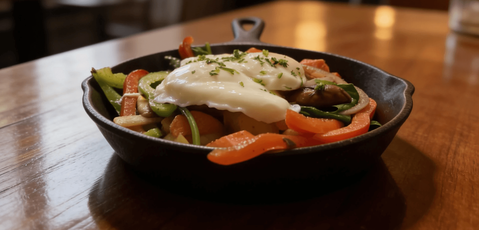 Carrots, Potatoes, Mushrooms, Onions, Bell Peppers, Cherry Tomatoes, Spinach, Poached Egg