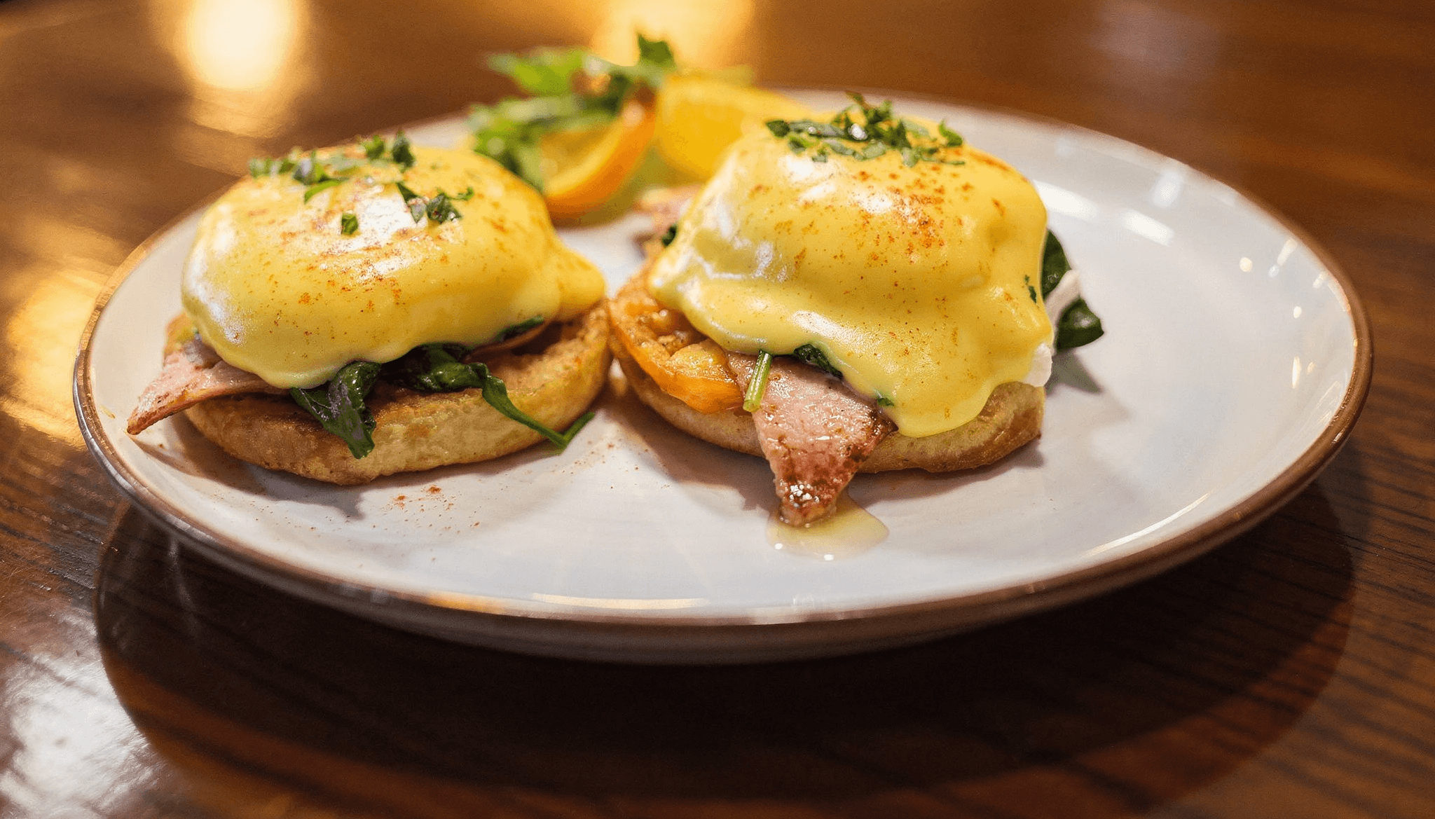 English Muffin, Tomatoes, Spinach, Ham, Poached Egg, Hollandaise, House Potatoes