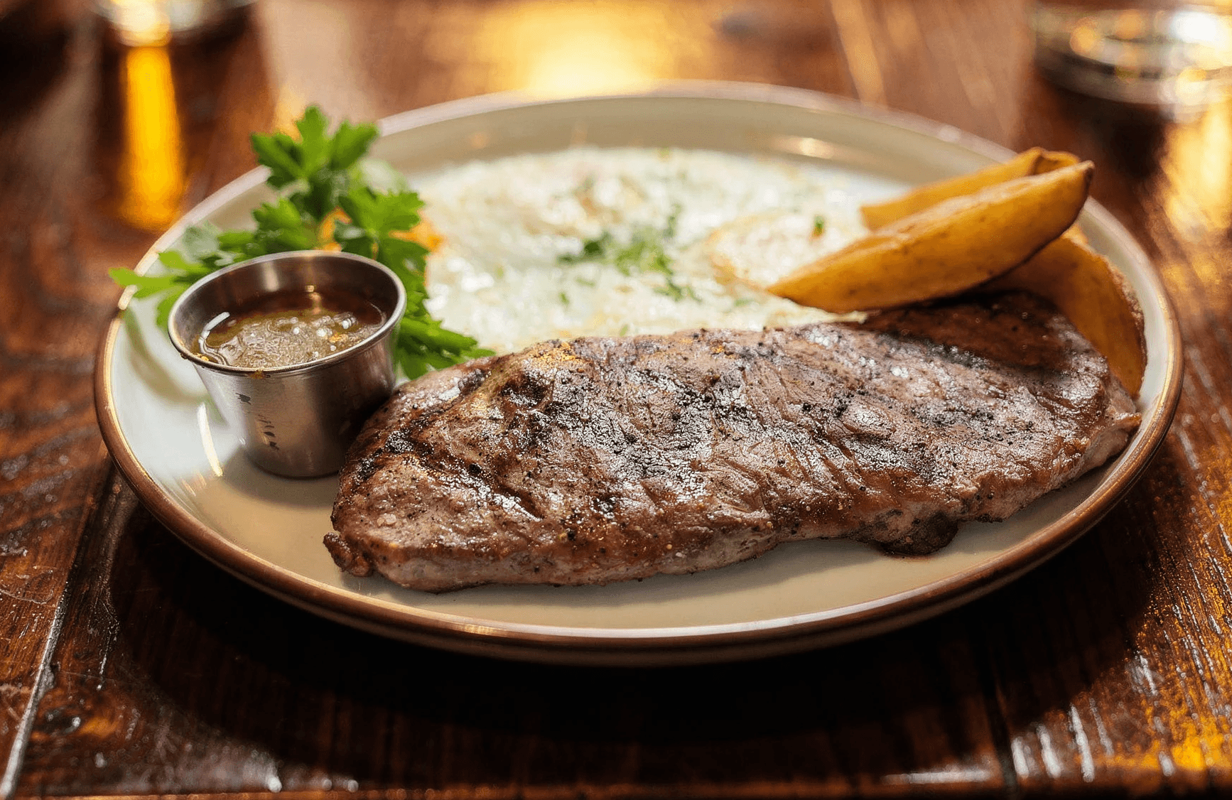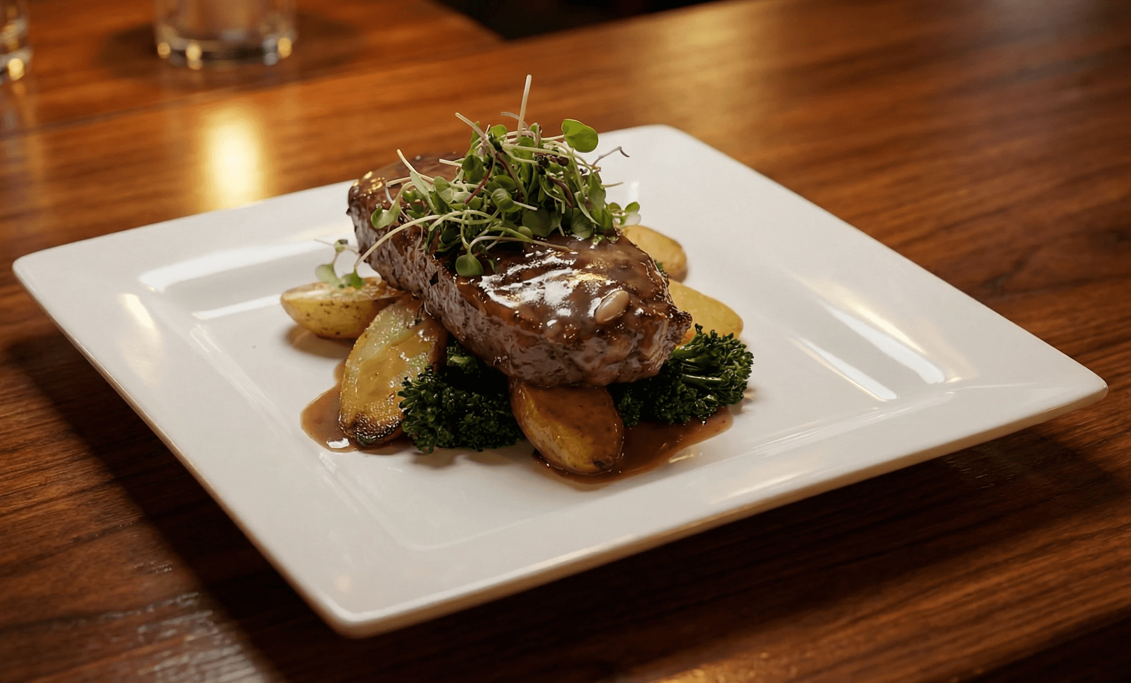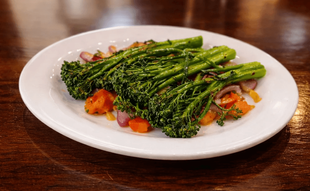 10oz Striploin Choice Cut, Roasted Fingerling Potatoes, Grilled Broccolini, Rosemary Demi Sauce