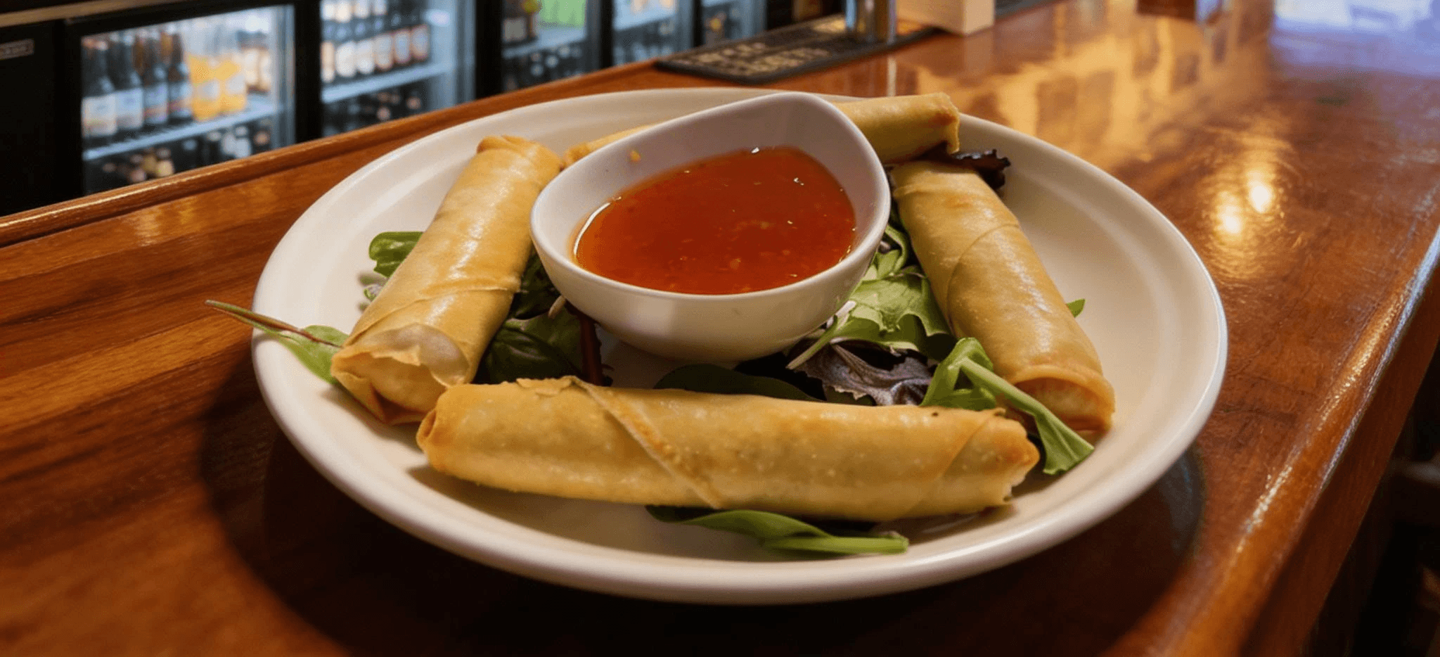 Crispy golden eggrolls filled with shrimp, pork, carrots, glass noodles, taro, green onions, shallots, and garlic, finished with savory oyster sauce.