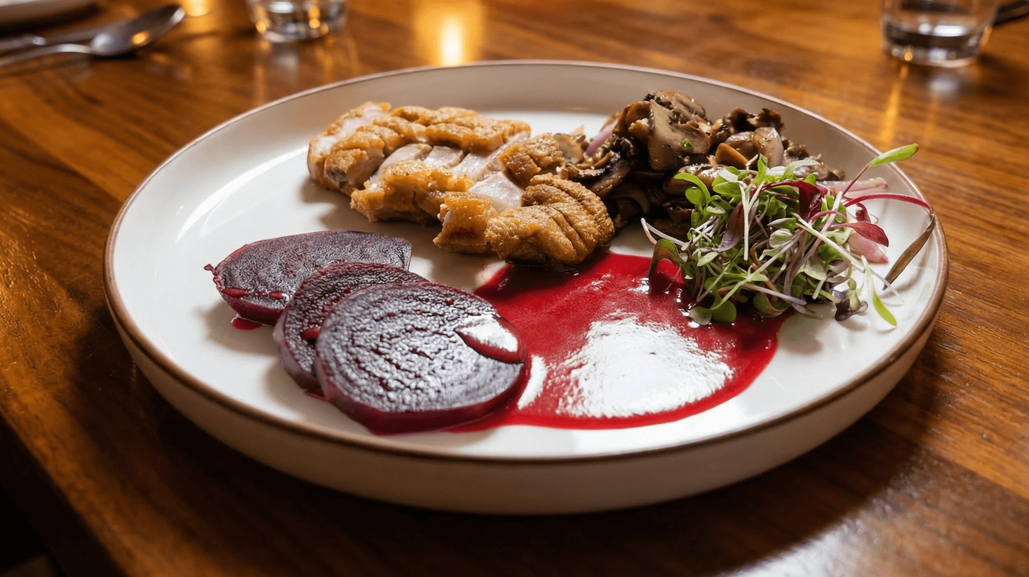 Pan Seared Duck Breast, Roasted Red Beets, Sauté Wild Mushroom, Demi Red Beets Sauce