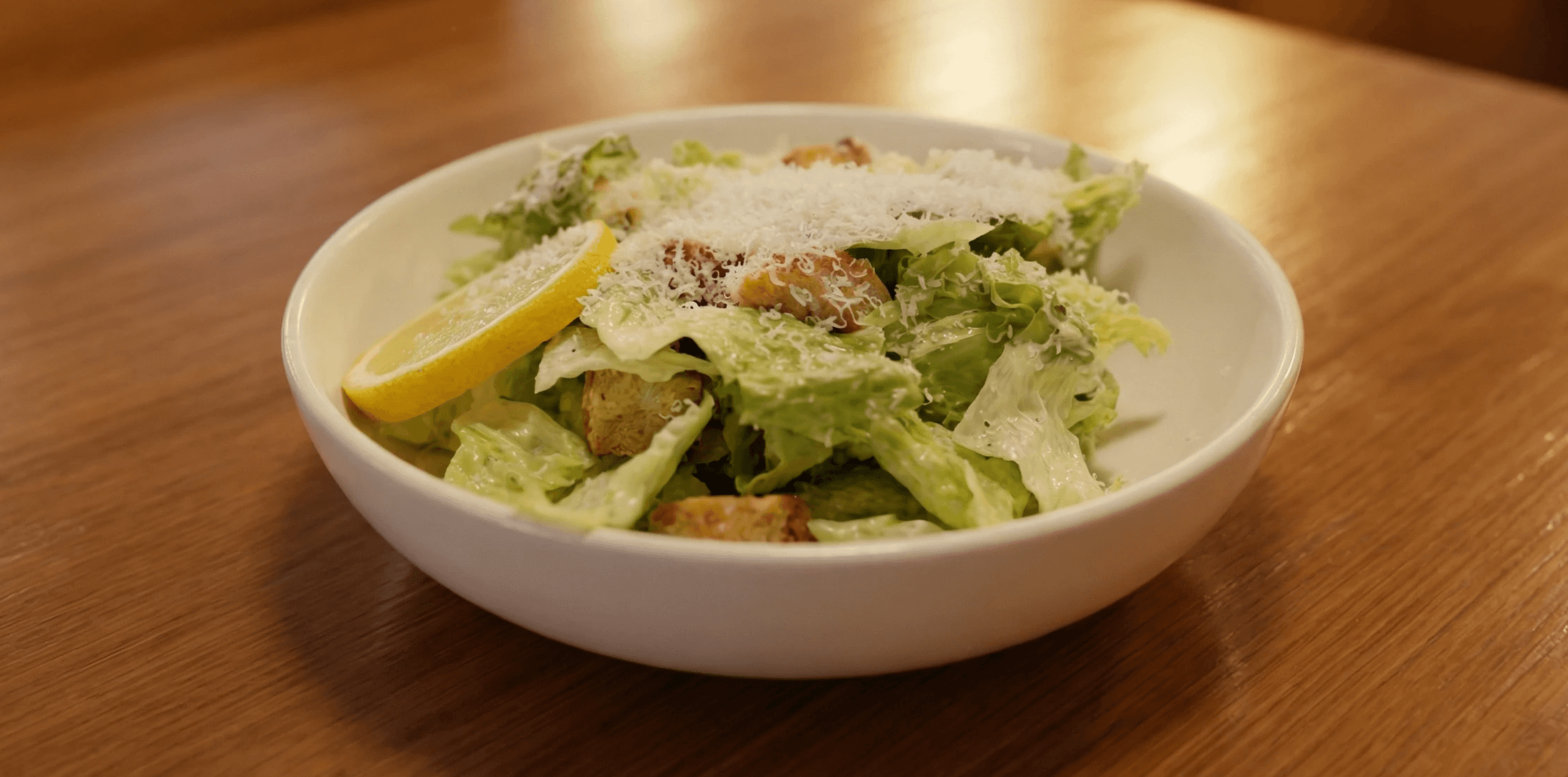 Crisp Heart of Romaine Lettuce, Shaved Parmesan, Toasted Croutons, and Creamy Caesar Dressing
