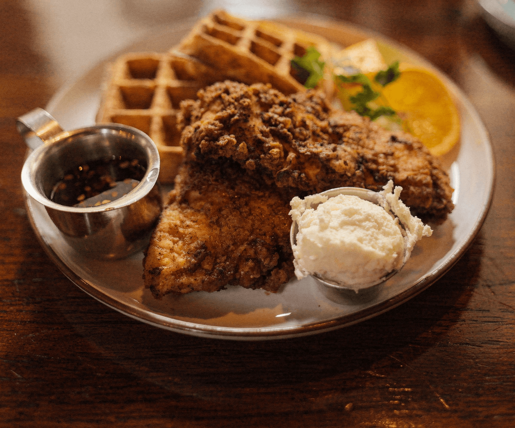 Fried Chicken, Two Waffles, Chili-Infused Syrup