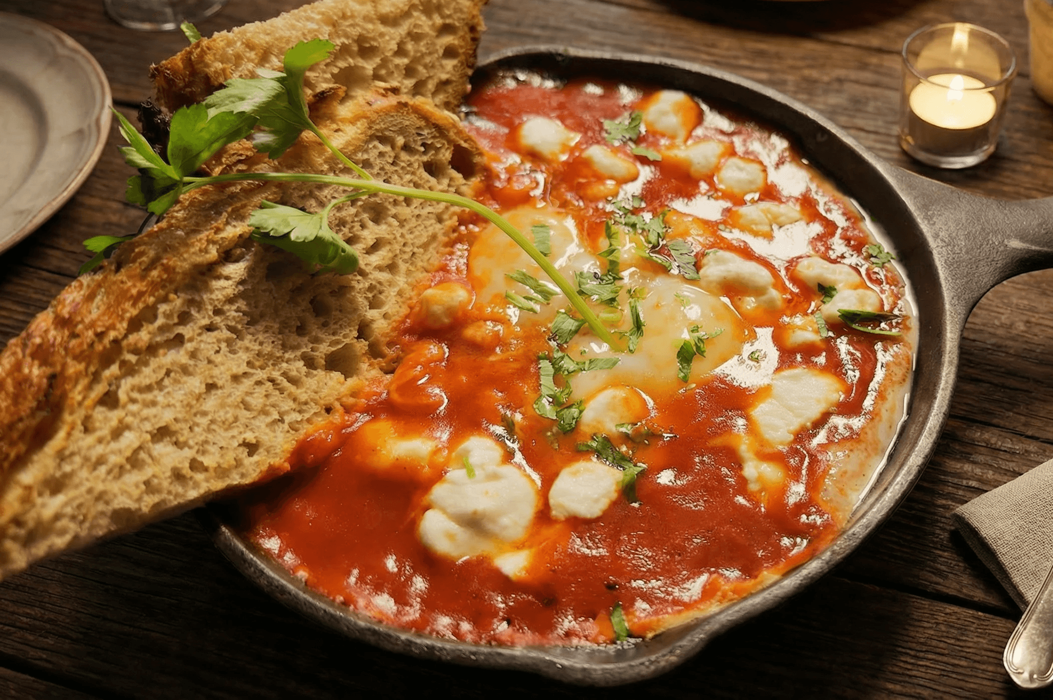 Savory tomato sauce, Goat cheese, Two eggs